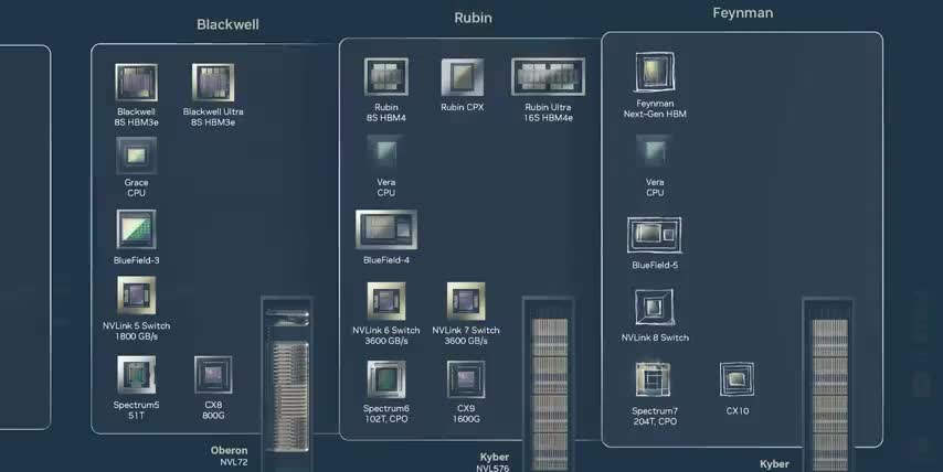 When Nvidia announces a new architecture like Blackwell or Rubin, they're not just talking about a new GPU. They're actually announcing at least six different chips that all work together. Every year, they co-design a new GPU, a new CPU, a new data processing unit or DPU, updated NVLink switch chips to connect GPUs inside a single rack, as well as InfiniBand and Spectrum X Ethernet chips that connect multiple racks together.